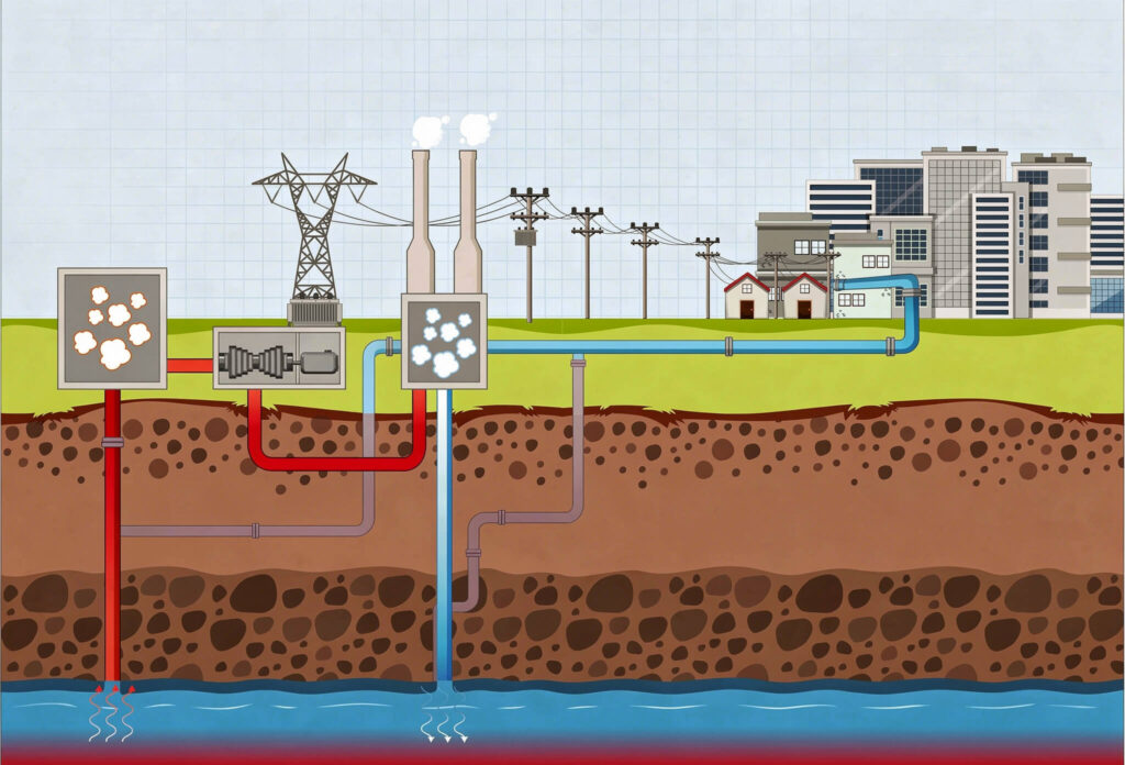 Geothermie ist eine Form der nachhaltigen Energiegewinnung, bei der wir die in der Erde gespeicherte Wärme nutzbar machen. In Südbayern setzen wir auf Tiefengeothermie im Malmkarst. Dort fördern wir heißes Thermalwasser aus mehreren tausend Metern Tiefe an die Oberfläche. Über moderne Wärmetauscher wird die Energie in das Fernwärmenetz eingespeist und anschließend als Heizwärme und Warmwasser in Wohn- und Gewerbegebäude transportiert. Das abgekühlte Wasser fließt danach zurück in die Tiefe, wodurch ein geschlossener Kreislauf entsteht.